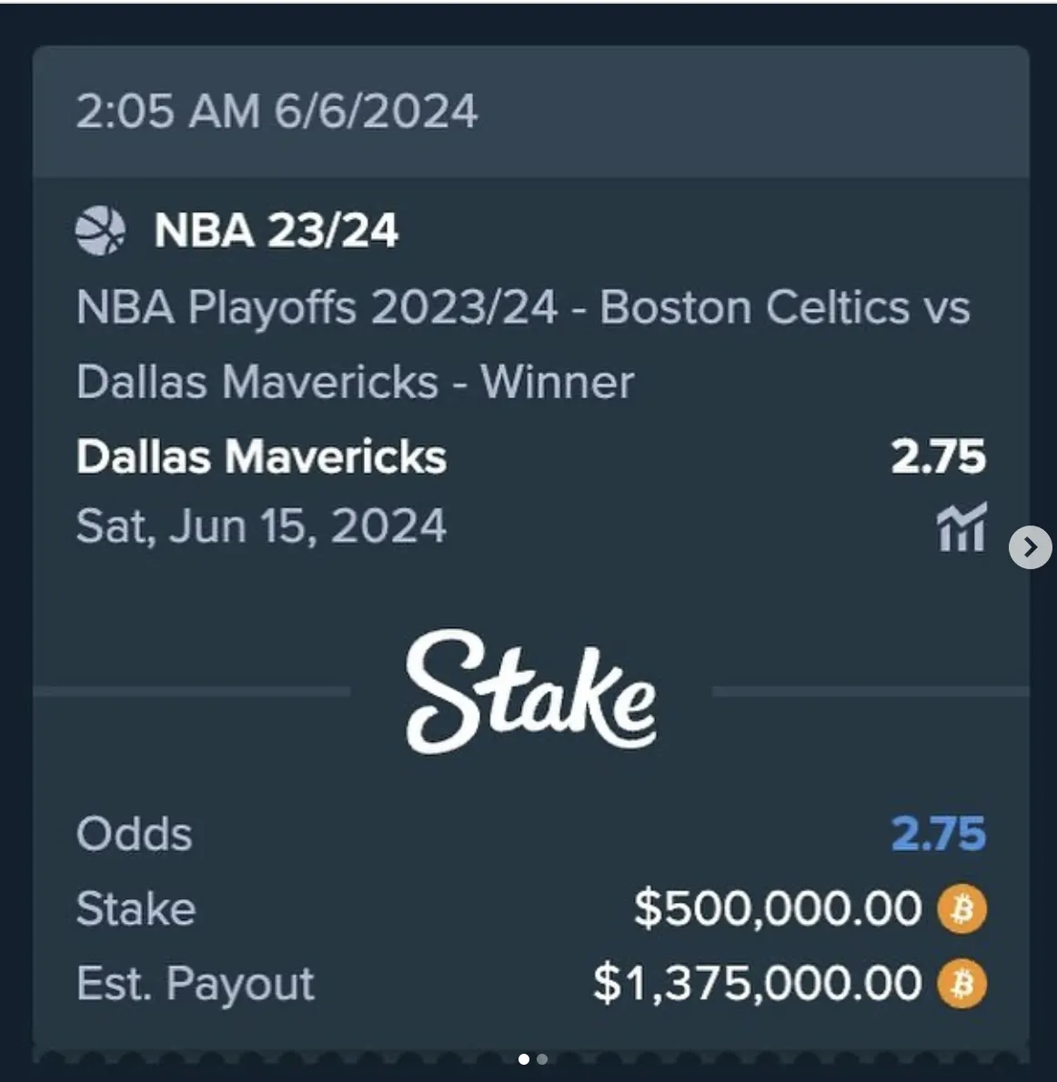 El 6 de junio, durante el fervor de las Finales de la NBA, Drake publicó en Instagram. Mostró una captura de pantalla en la que aparecía su cuantiosa apuesta en Bitcoin a favor de los Mavericks, con ganancias potenciales de 1,37 millones de dólares.