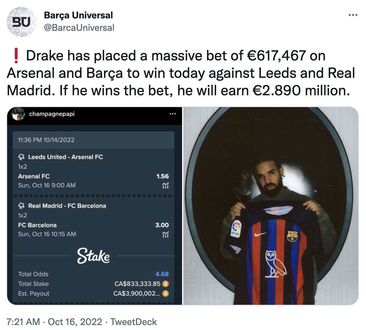 Según información sustraída por Barça Universal, un canal independiente que cubre noticias sobre el FC Barcelona, el rapero canadiense estableció una apuesta gigante por más de 600.000 dólares (exactamente de 617,467 dólares) donde dependía de la victoria del Barcelona contra el Real Madrid en la liga española y paralelamente la victoria del Leeds contra el Arsenal en la liga inglesa.
