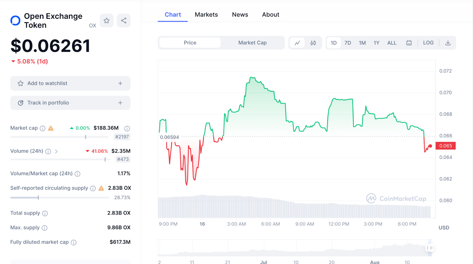 Según los datos de CoinMarketCap, el token nativo de OPNX Exchange (OX) cotiza a 0,06261 dólares, un 5% menos en las últimas 24 horas.