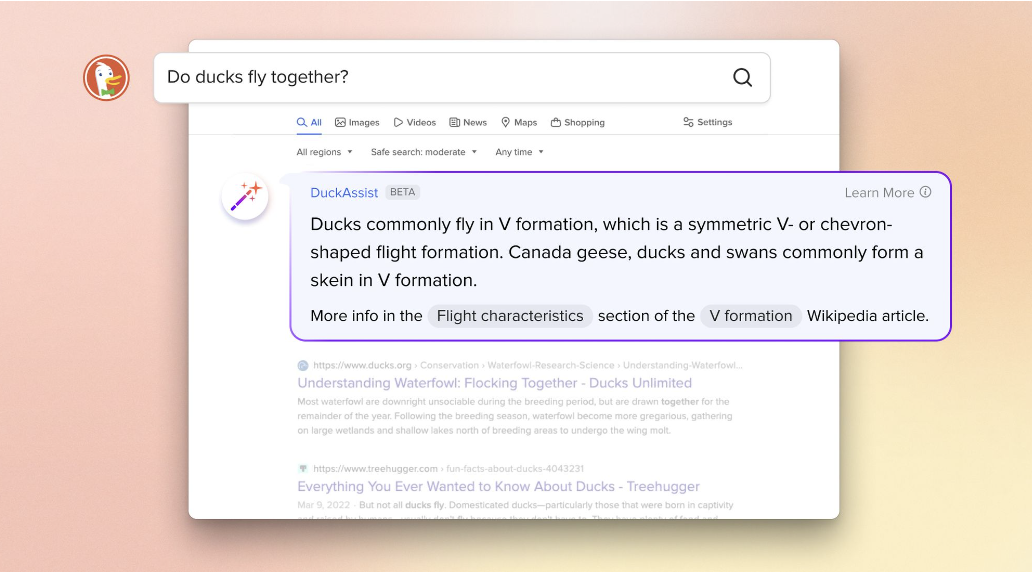 DuckAssist responde a preguntas escaneando un conjunto específico de fuentes, por ahora esto se limita generalmente a Wikipedia y ocasionalmente sitios relacionados como Britannica. Sin embargo, gracias a los modelos generativos estas respuestas deberían ser mucho más esclarecedoras y personales a las consultas que los resultados de búsqueda tradicionales. La misma empresa admitió que la IA está transformando el mundo de los buscadores y la obtención de información en gran medida.