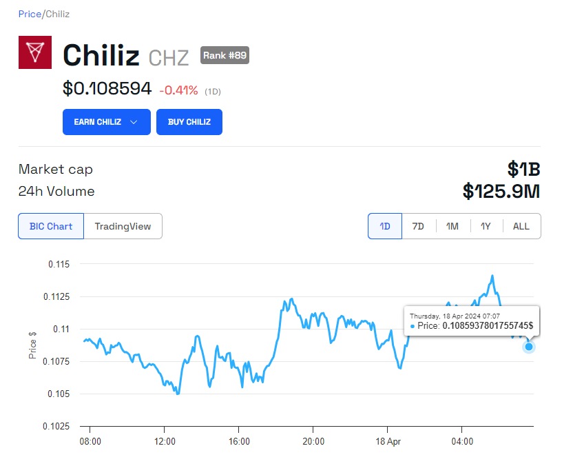 A pesar de su anuncio de alto perfil con la UAE Pro League, el token nativo de Chiliz (CHZ) no ha visto un impulso correspondiente en el precio. Actualmente negociado a 0,10 dólares, CHZ ha experimentado un descenso del 0,41% en las últimas 24 horas.