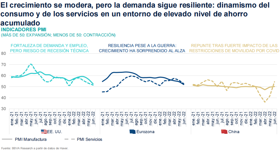 En ese contexto, la institución redujo sus pronósticos de crecimiento, a la vez que consideró una posible recesión en Estados Unidos. Aún así, los pronósticos no son tan oscuros; BBVA previene un crecimiento del PIB mundial de 3,4% en 2022 y 2,5% en 2023 (-0,6pp y -1,1pp en cada caso con respecto a las previsiones anteriores). Por tanto, el crecimiento será moderado, pero con una demanda resiliente ante los shocks externos.
