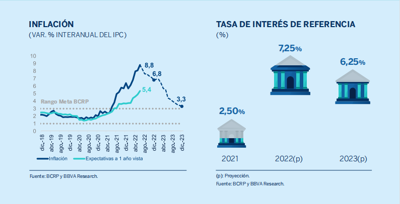 Estas presiones inflacionarias de gran duración llevarían al Banco Central de Reserva de Perú (BCRP) a continuar incrementando la tasa de interés de referencia, ubicándola en un nivel relativamente restrictivo a finales del año. Se prevee que la tasa alcanzaría el 7,25% al cierre del 2022. Este último factor dependerá también del grado de insistencia que tenga la Fed en su “lucha” contra la inflación.