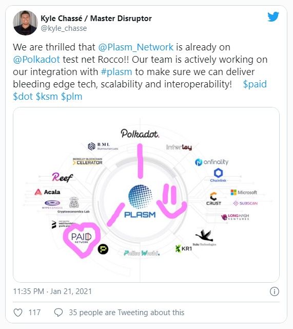El 22 de enero, el CEO de PAID Network, Kyle Chassé, tuiteó sus saludos por la conexión de Plasm Network en Rococo v1, la testnet de Polkadot. Para Plasm, una cadena lateral en Polkadot es importante para proyectos como PAID, considerando el alcance cada vez mayor de Polkadot. Plasm Network anunció la conexión local como la primera paracadena de Polkadot en Rococo v1 el 15 de enero.