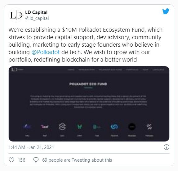 LD Capital de China tuiteó el anuncio sobre el inicio del Fondo del Ecosistema Polkadot el 21 de enero. El fondo se dedicará al apoyo de capital, la creación de comunidades, la asesoría de desarrollo y la comercialización de proyectos en etapa inicial centrados en Polkadot. LD Capital fijó el fondo en 10 millones de dólares.