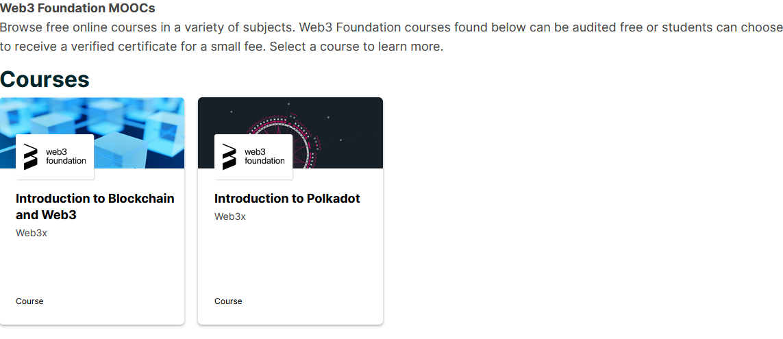 Web3 Foundation, en asociación con edX, una plataforma global líder de aprendizaje en línea de 2U, está lanzando Web3x; cursos básicos (MOOCs) sobre tecnología Polkadot, Web 3.0 y blockchain. Los cursos cubren los fundamentos de la tecnología blockchain y Polkadot, incluido el marco de blockchain Substrate y el lenguaje de programación Rust.