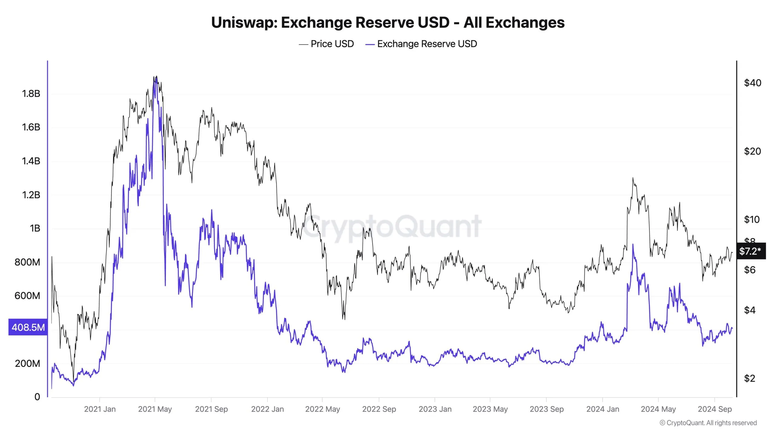 “Por ejemplo, si el cambio de tarifas de Uniswap hubiera sido activado, su tesorería podría tener 314 millones de dólares. Actualmente, hay 408 millones de dólares en UNI en exchanges centralizados. Si la tesorería se usara para recompras, los precios podrían haberse disparado entre 10x-100x, dependiendo de la profundidad del libro de órdenes. (No es un consejo financiero; no poseo UNI.),” explicó Ki Young Ju.