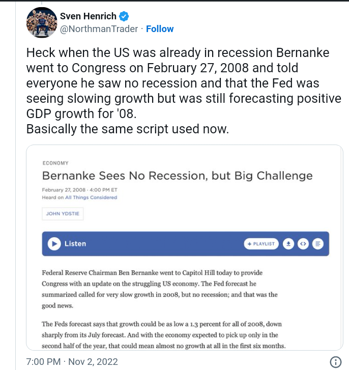 La resuelta negativa de la Casa Blanca a reconocer al elefante en la habitación puede ser demasiado fuerte. Es difícil imaginar que la recesión esté completamente fuera de la agenda en los Estados Unidos. Basado en la interconexión de una economía global que está recibiendo una paliza sin precedentes este año.
