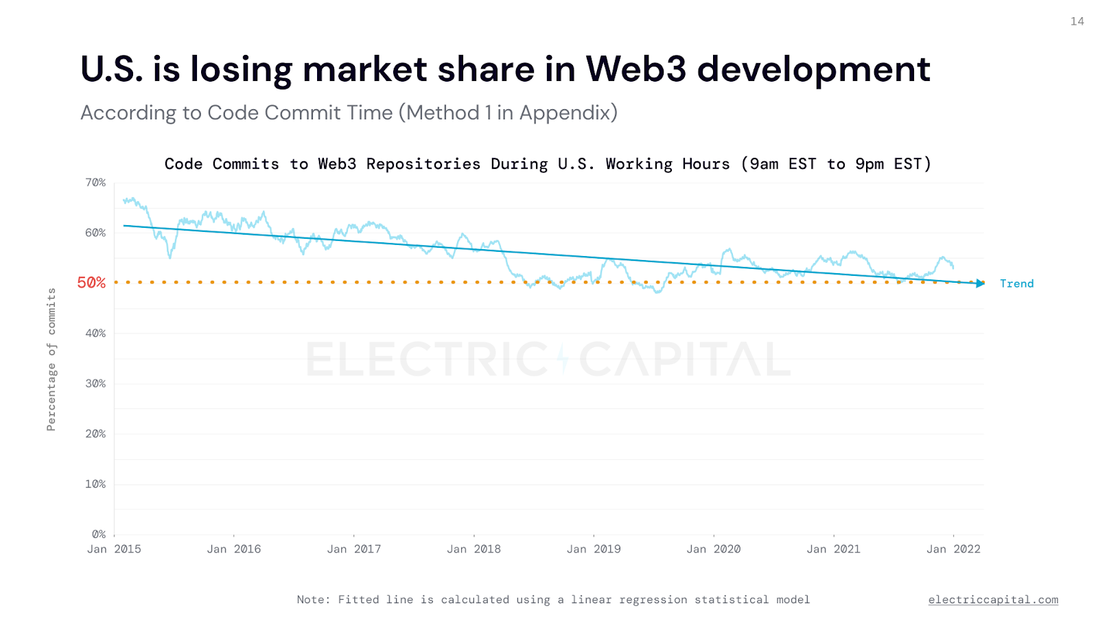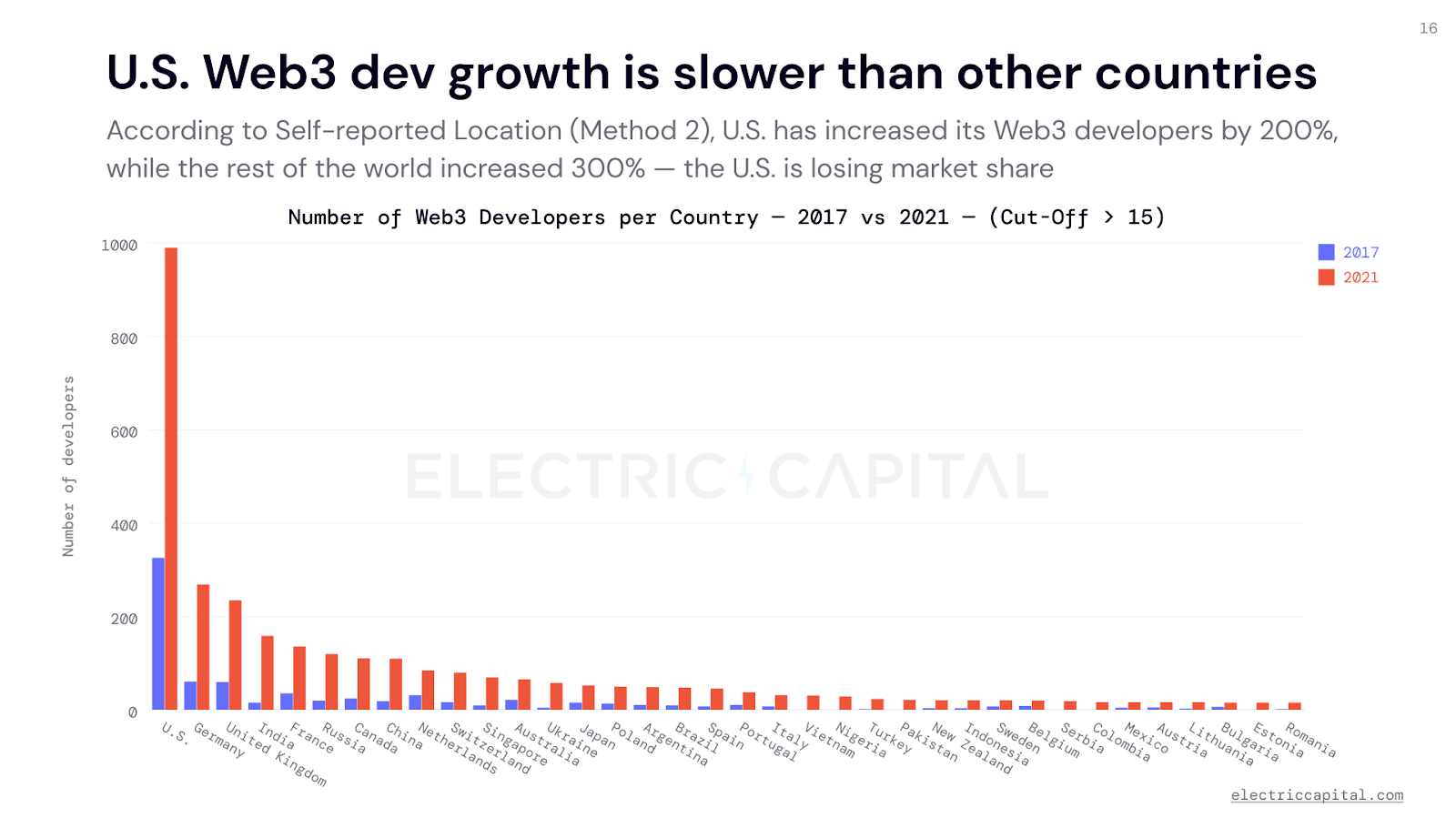 Estados Unidos está perdiendo cuota de mercado general en términos de desarrolladores de la Web 3.0, según datos de la empresa de criptocapital de riesgo Electric Capital.