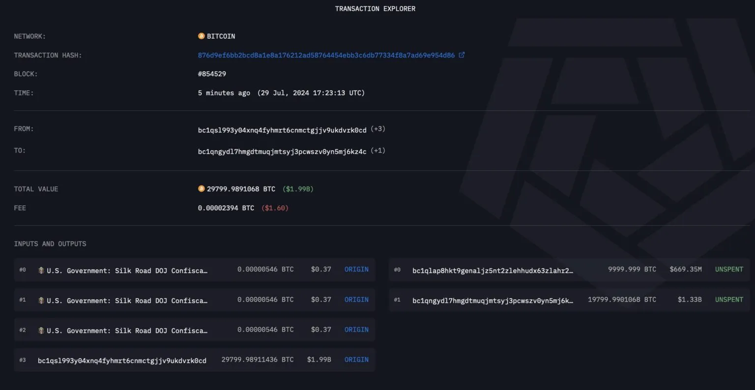 Según Arkham, inicialmente, el gobierno de Estados Unidos transfirió esos Bitcoins a la dirección ‘bc1qs’. Alrededor de una hora después de esta transacción, estos activos se dividieron entre dos direcciones. La primera recibió 10,000 BTC, valorados en 669,35 millones de dólares, mientras que la segunda obtuvo 19,800 BTC, valorados en 1,33 mil millones de dólares.