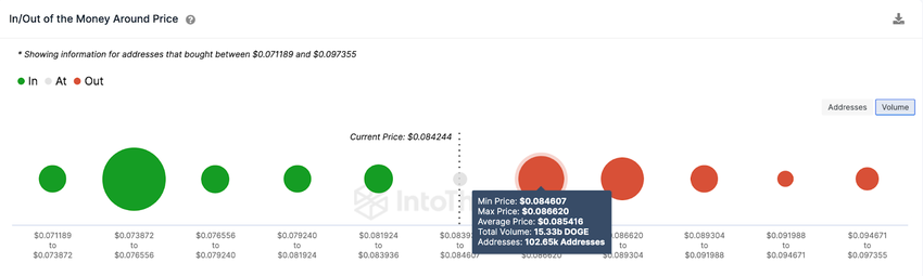 Los datos de precios In/Out of Money Around de IntoTheBlock sugieren que Dogecoin pronto podría volver a estar por encima de 0.09 dólares.