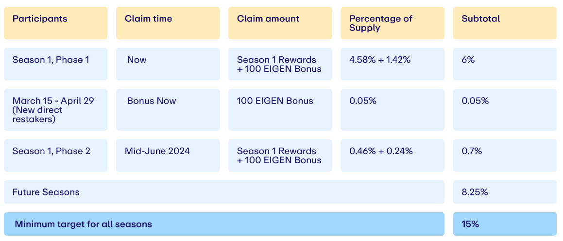 EigenLayer pretende asignar a los usuarios el 15% de sus 1.600 millones de tokens totales. Tras las controversias que rodearon al airdrop inicial, está prevista una segunda fase del airdrop de la segunda temporada para mediados de junio.