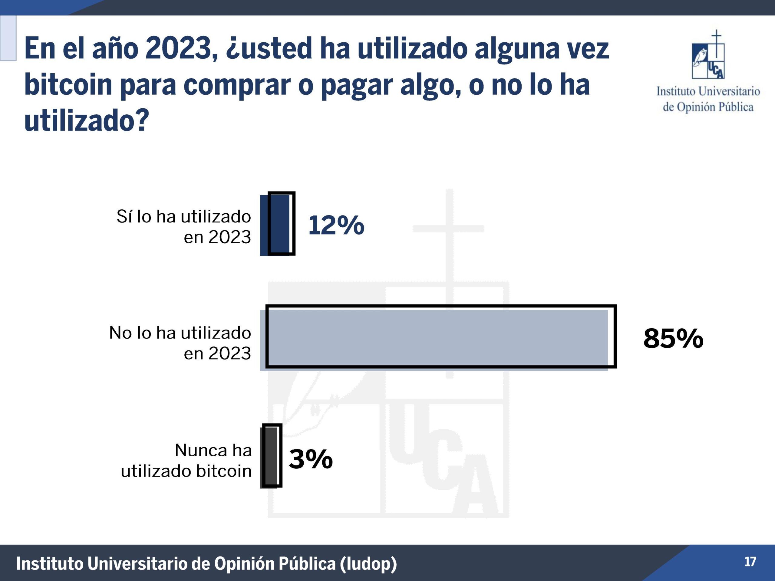 Una nueva encuesta realizada por la Universidad Centroamericana (UCA) afirma que solo el 88% de los salvadoreños no utilizó Bitcoin en sus transacciones durante 2023.