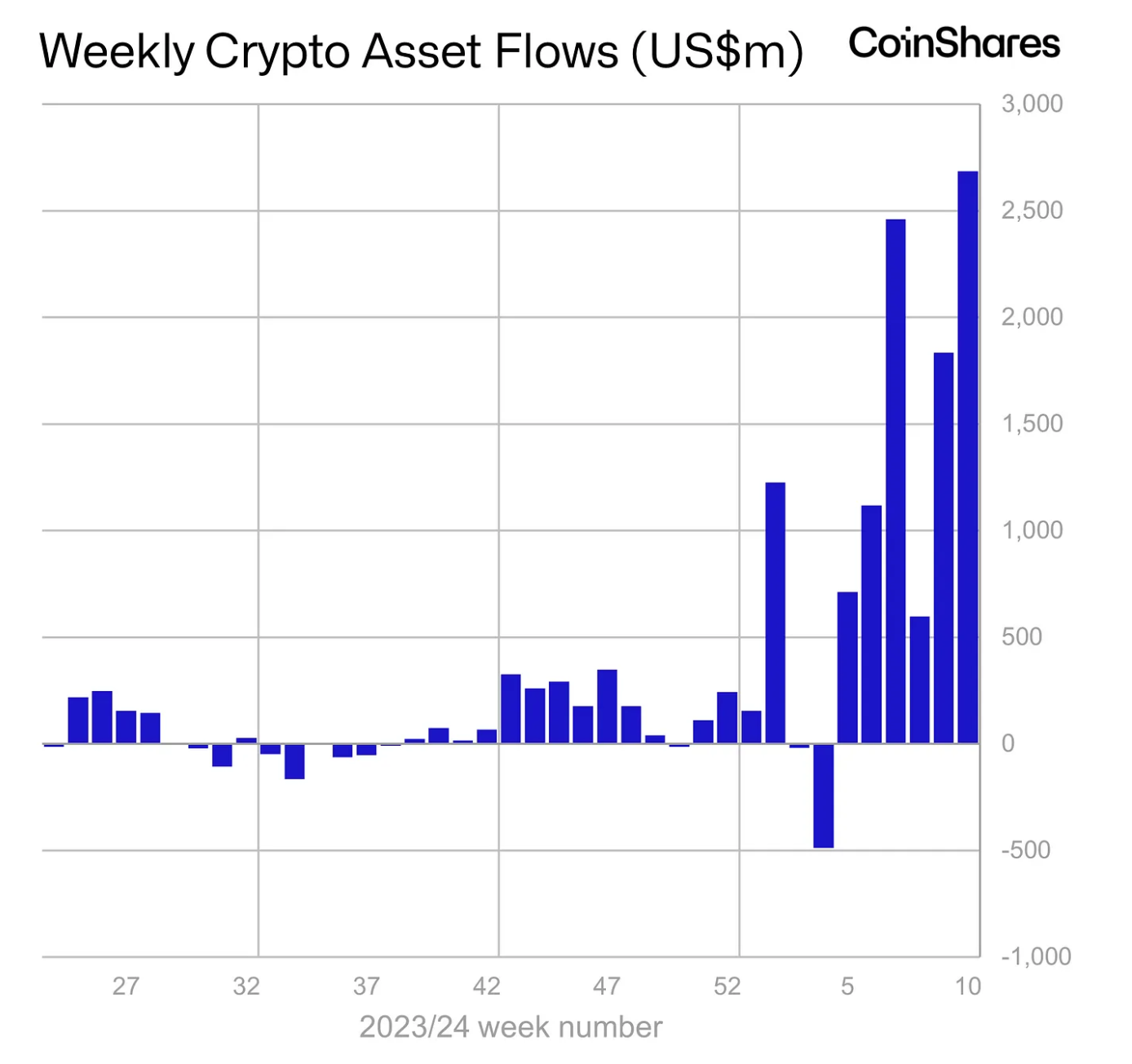 El interés mundial por Bitcoin y las criptomonedas se ha puesto aún más de relieve en un reciente informe sobre la afluencia de criptoactivos. Según CoinShares, la semana pasada se registró un flujo récord de 2,700 millones de dólares en criptoactivos, la mayor parte de los cuales se destinaron a Bitcoin.