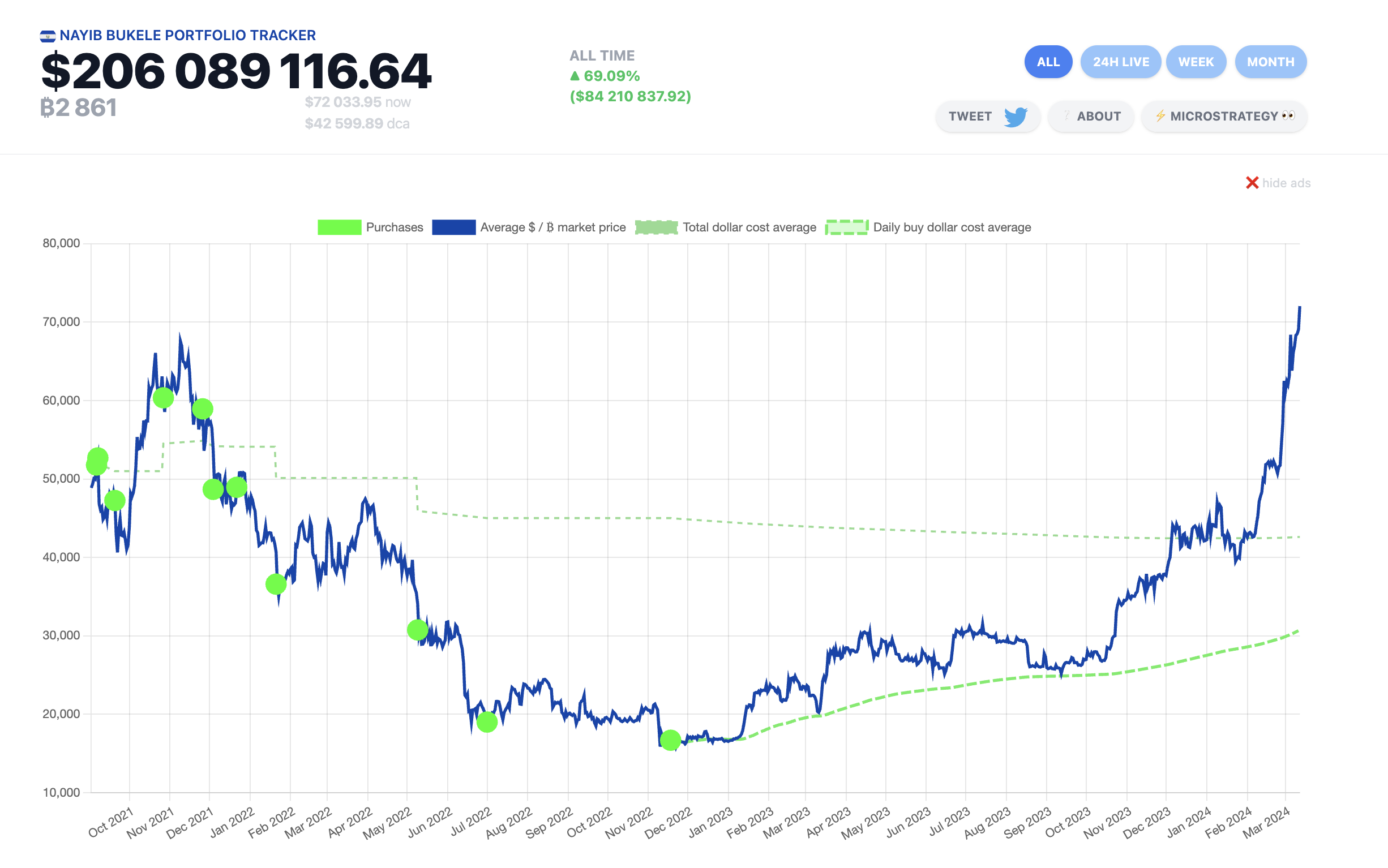 Desde 2021, El Salvador ha comprado Bitcoin de forma agresiva, adquiriendo un total de 2,861 BTC a un precio promedio de 42,599 dólares cada uno.