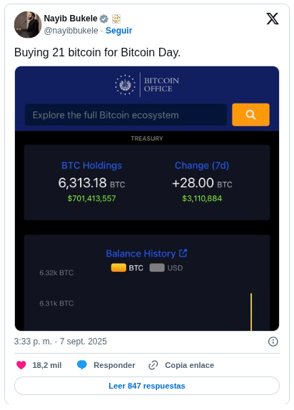 El Salvador acumula actualmente 6,313 BTC a cuatro años de la entrada en vigor de la Ley Bitcoin, conmemorados con una compra simbólica de 21 unidades de la criptomoneda. La medida refuerza la estrategia de reservas liderada por el presidente Nayib Bukele, que ha situado al país en el centro del debate económico global.