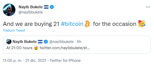 El presidente de El Salvador, Nayib Bukele, anunció que el país agregó más BTC a sus reservas. La compra se realizó el 21 de diciembre, en la que se compraron 21 BTC a las 21:00.