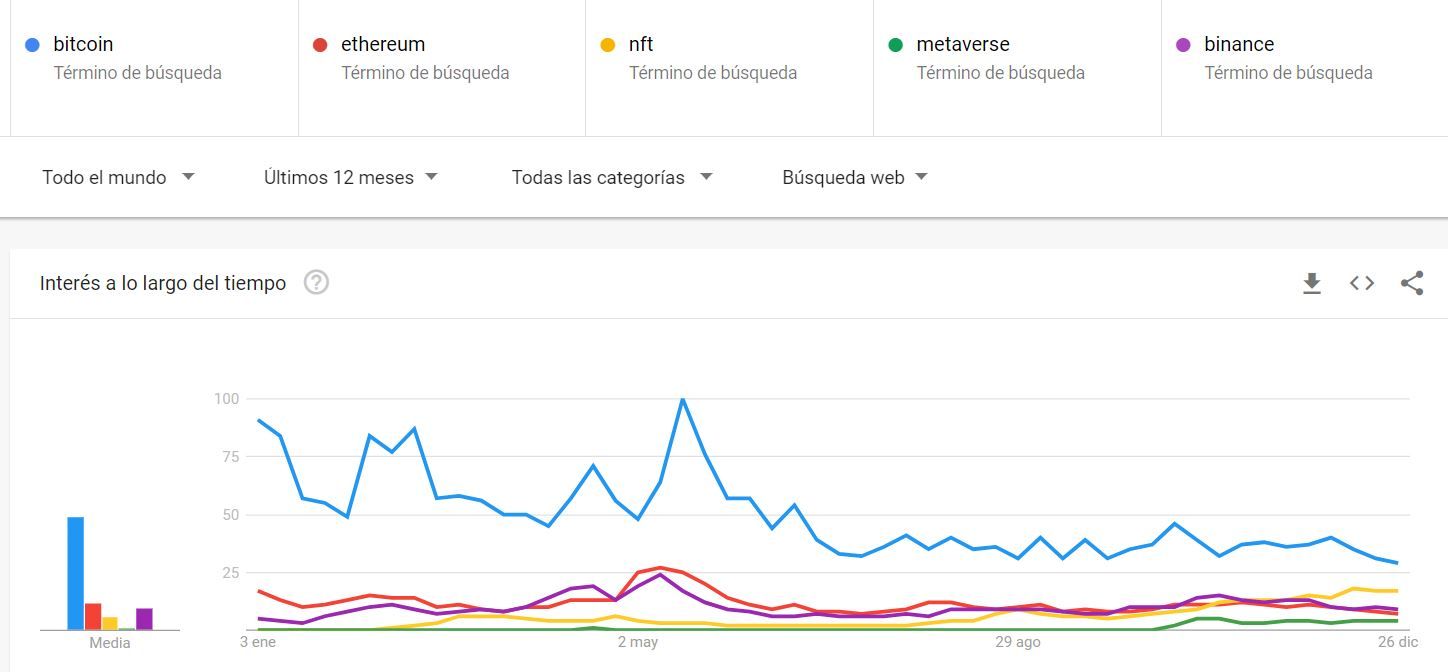 Datos de Google Trends exponen que después de Bitcoin, los términos más buscados fueron Ethereum, NFT, metaverso y Binance, con 7, 17, 9 y 4%, respectivamente. En tanto, el país que abanderó las búsquedas de BTC fue El Salvador, a partir de agosto de 2021, un mes antes de que entrara en vigor la Ley Bitcoin.