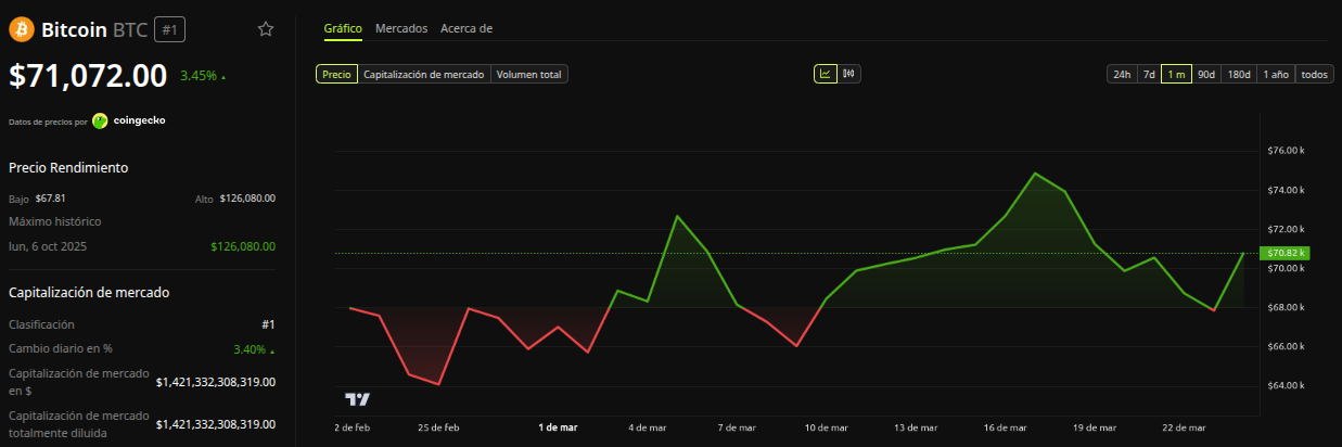 El contexto actual muestra a Bitcoin cotizando por encima de los 71,000 dólares tras recuperarse de varias jornadas en rojo. Este comportamiento contrasta con ciclos anteriores, donde caídas generaban presión para liquidar posiciones. En cambio, El Salvador ha optado por aumentar exposición en momentos de debilidad.