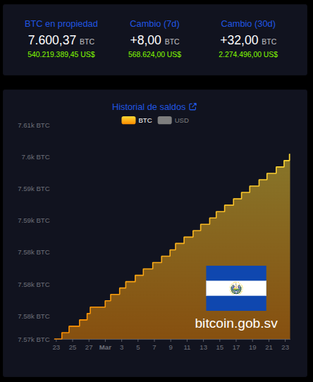 Según datos oficiales, el país centroamericano ya acumula un total de 7,600.37 BTC. Esta cifra sitúa el valor total de las reservas cerca de los 540 millones de dólares.