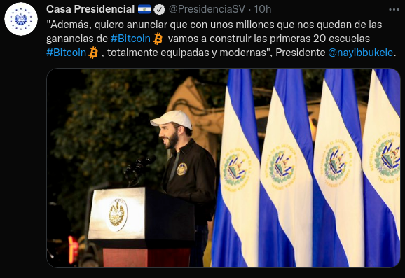 El presidente de El Salvador, Nayib Bukele, anunció que el gobierno utilizará las ganancias de Bitcoin (BTC) para construir 20 escuelas totalmente equipadas y modernas.
