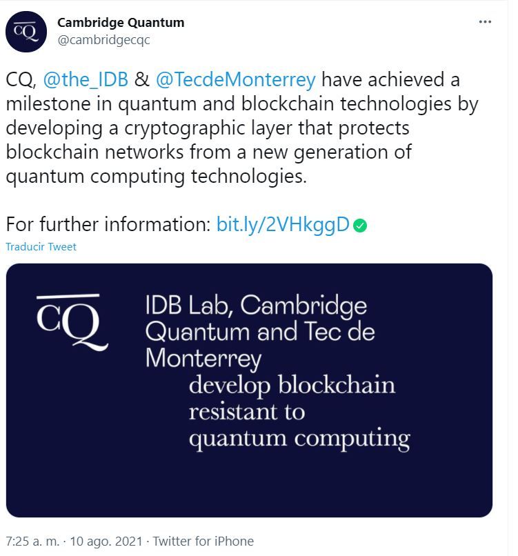 La universidad Tecnológico de Monterrey, en conjunto con BID Lab, Inter-American Development Bank y Cambridge Quantum (CQ), informaron que diseñaron una solución blockchain resistente ante eventuales amenazas potenciales a ordenadores cuánticos.