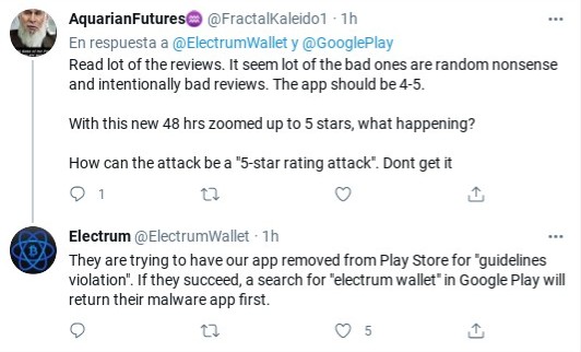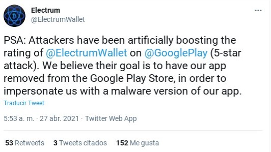 “Anuncio de servicio público: los atacantes han aumentado artificialmente la calificación de @ElectrumWallet en @GooglePlay (ataque de 5 estrellas). Creemos que su objetivo es eliminar nuestra aplicación de Google Play Store para suplantarnos con una versión malware de nuestra aplicación”.