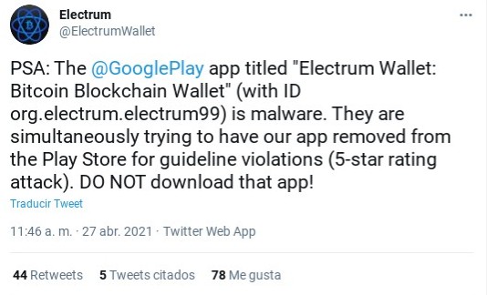 “Anuncio de servicio público: La aplicación @GooglePlay titulada “Electrum Wallet: Bitcoin Blockchain Wallet” (con ID org.electrum.electrum99) es malware. Al mismo tiempo, están tratando de eliminar nuestra aplicación de Play Store por infracciones de las directrices (ataque de calificación de 5 estrellas). ¡NO descargue esa aplicación!”.