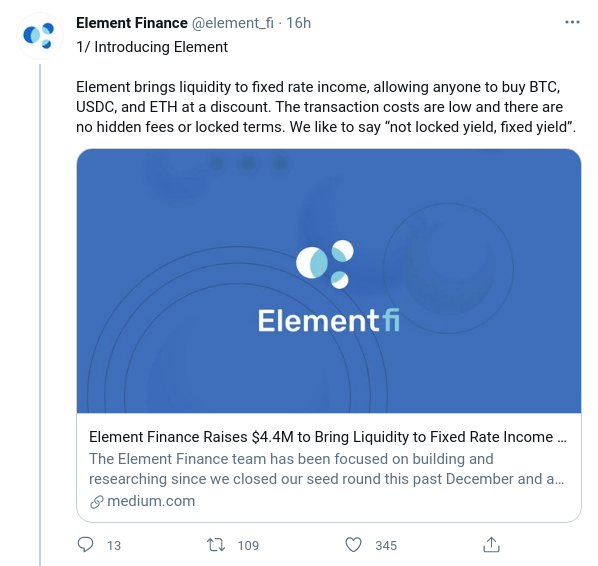 El protocolo de finanzas descentralizadas (DeFi) Element ha completado una ronda inicial para desarrollar rendimientos de tasa fija más altos que los que se pueden encontrar en las plataformas existentes.