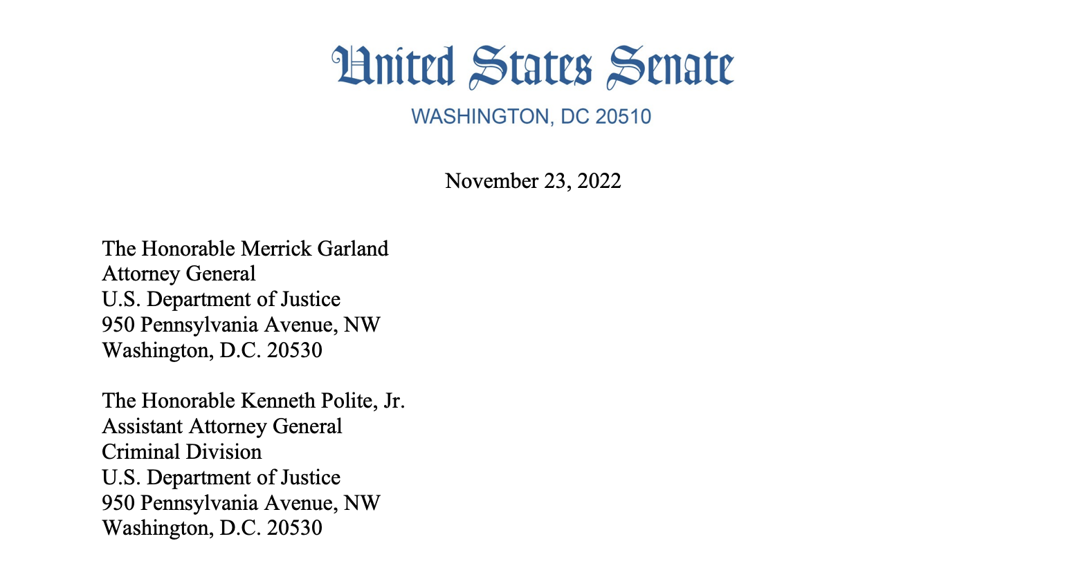 La carta señalaba el compromiso de Garland en los discursos en el Instituto Nacional de Delitos de Cuello Blanco de la Asociación Estadounidense de Abogados, donde prometió un enfoque renovado en las víctimas de los delitos de cuello blanco.