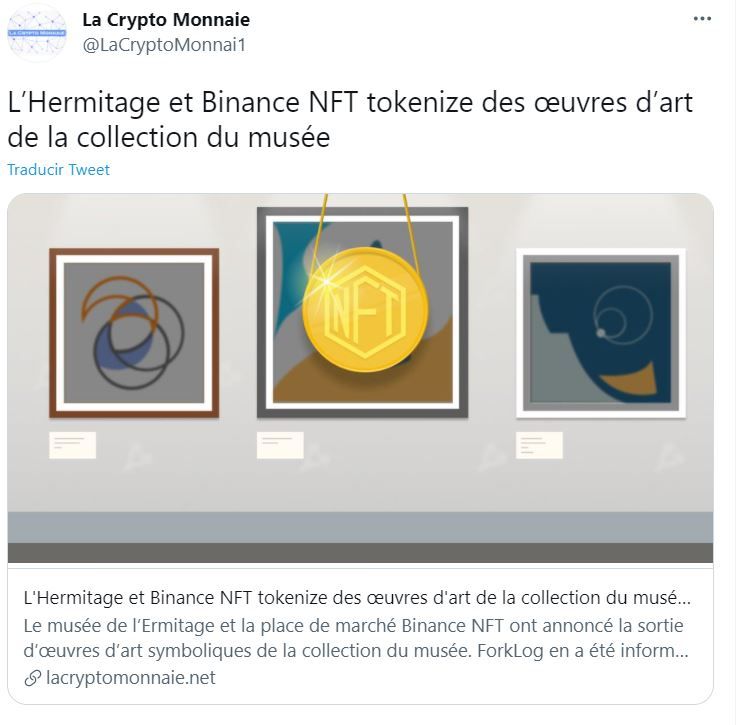 Uno de los museos más icónicos de Rusia, Hermitage, ubicado en San Petersburgo, acordó con el exchange de criptomonedas Binance crear y lanzar una colección de NFT a finales de agosto de la colección del recinto con tokens limitados y que no violen la legislación del mercado ruso.