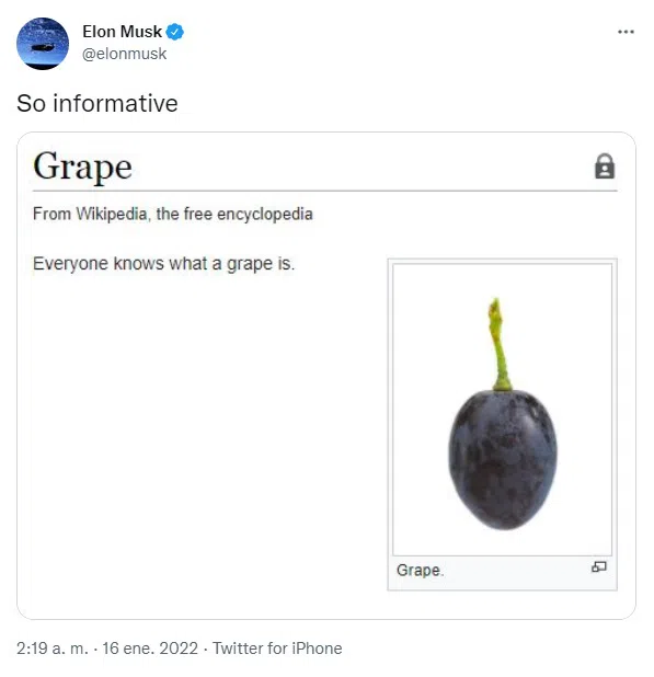 A principios de 2023, el magnate compartió la imagen de una uva de un post de Wikipedia cuyo título era “Grape” (uva en inglés). Al igual que en casos precedentes, el token GRAPE casi duplicó su precio en tan solo cuatro horas.