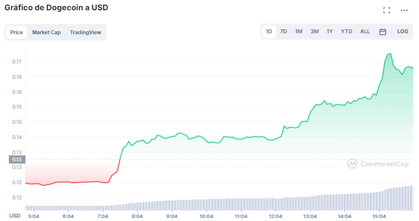 Al momento de la publicación, DOGE cotiza a 0.1648 dólares habiendo iniciado la jornada en aproximadamente 0.128 dólares, según los datos de CoinMarketCap.