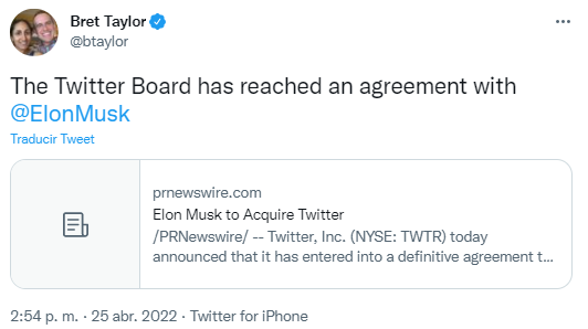 La noticia fue confirmada durante la tarde el lunes 25 de abril. El presidente de la junta independiente de Twitter, Bret Taylor, señaló a través de su cuenta oficial en Twitter: