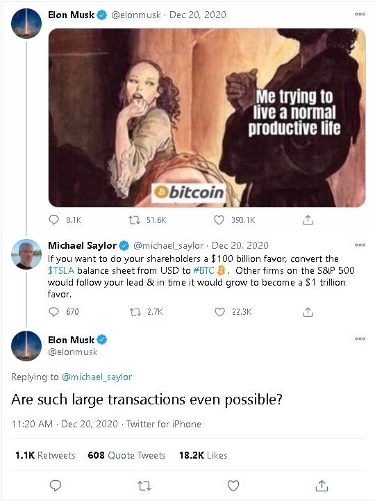 SponsoredEl 20 de diciembre de 2020 Elon publicó un meme dedicado a Bitcoin que fue respondido por Michael Saylor, el empresario pro-bitcoin con gran prestigio en la comunidad Bitcoin. Saylor trasladó la broma de Elon hacia la seriedad del asunto, expresándole que: