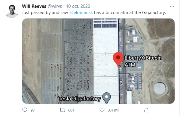 En el mes de octubre del 2020 el usuario de Twitter Will Reeves, aseguró a través de su cuenta que Elon Musk tenía un cajero de BTC en la Gigafábrica 1 de Tesla, una enorme fábrica de baterías de iones de litio, ubicada en Reno, Nevada, tal como reseñó BeInCrypto.