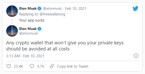 Musk parece haber hecho sus deberes y, el 10 de febrero, se quejó del monedero de custodia Freewallet por no permitir que los usuarios retengan sus claves privadas.