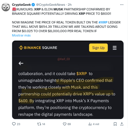 Todo comenzó con publicaciones en agregadores de noticias y redes sociales que afirmaban que Musk planeaba usar XRP en plataforma de pagos en X. Incluso se citaban “filtraciones” sin fuente verificable.