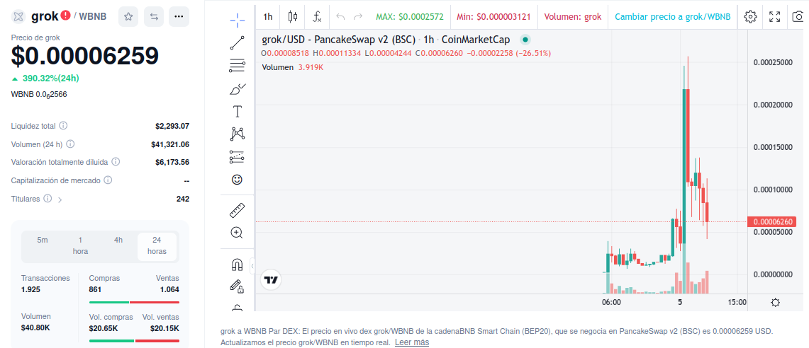 Sin embargo, el token ha experimentado un clásico esquema pump and dump y, al momento de la publicación, grok cotiza en 0.0000637 dólares.