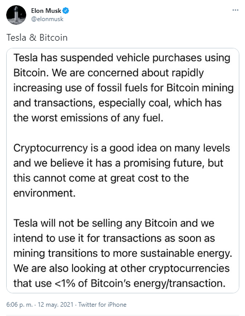 Sponsored“Tesla ha suspendido las compras de vehículos con Bitcoin. Nos preocupa el uso cada vez mayor de combustibles fósiles para la minería y transacciones de Bitcoin, especialmente el carbón, que tiene las peores emisiones de cualquier combustible”.