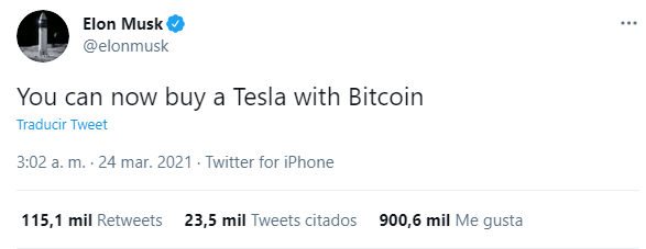 El conocido amante de las criptomonedas tuiteó que “ahora se puede comprar un Tesla con Bitcoin”. El tweet se volvió viral de inmediato, con más de 15.000 retuits en cuestión de minutos.