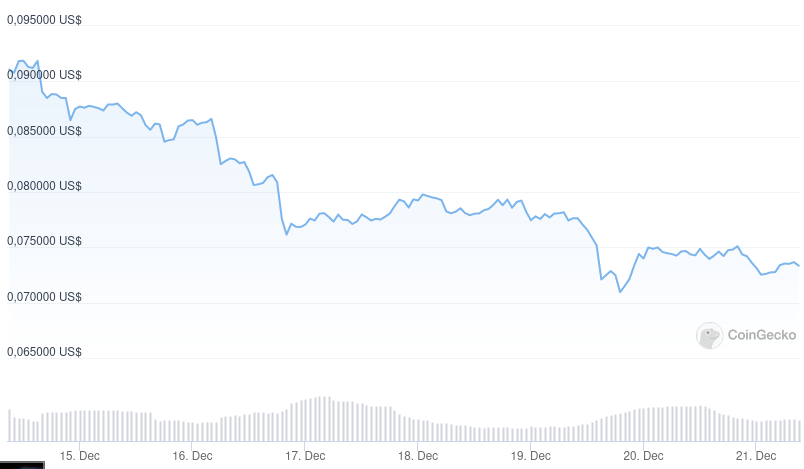 Al momento de la publicación, la criptomoneda meme cotiza en 0.073 dólares, según los datos de CoinGecko. DOGE registra una caída del 1.7% en las últimas 24 horas y se ha desplomado 27% en las últimas dos semanas.