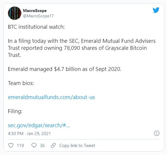 Emerald Mutual Fund Advisors Trust se presentó ante la Comisión de Bolsa y Valores (SEC) el 29 de enero. Las tenencias incluyen 78.090 acciones de Grayscale Bitcoin Trust (GBTC).