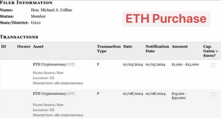 Según un informe de X account Insider Tracker, que supervisa las acciones de CEOs, ejecutivos y congresistas, Michael Collins, representante de Estados Unidos por Georgia, habría realizado dos transacciones de compra de Ethereum en las últimas dos semanas.