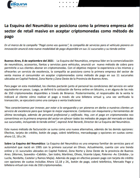 La Esquina del Neumático es la primer empresa masiva de retail de Buenos Aires, Argentina, en aceptar 350 criptomonedas disponibles en Binance, como método opcional de pago para sus clientes en cualquiera de sus servicios.