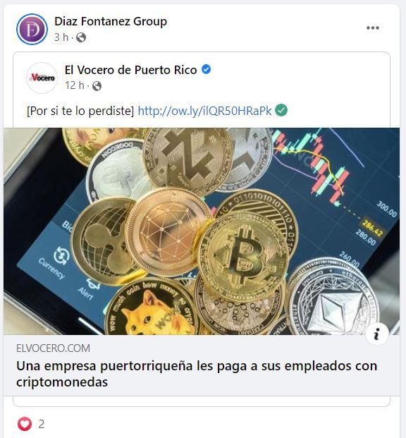 La empresa de servicios empresariales y recursos humanos, Díaz Fontanez Group de Puerto Rico informó que desde el 9 de febrero comenzó a pagar a sus trabajadores y personal con criptomonedas, para facilitar pagos, ya que parte de su plantilla laboral está en el extranjero.