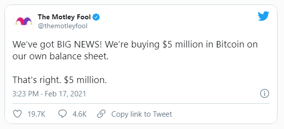La empresa privada de asesoramiento financiero y de inversión, The Motley Fool, ha anunciado que comprará Bitcoin (BTC) por un valor de 5 millones de dólares como parte de su campaña 10x.