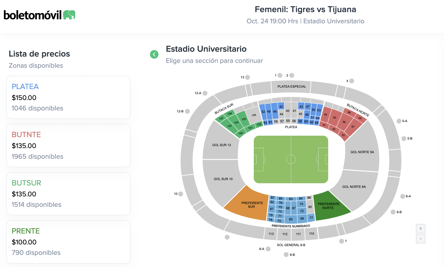 Los tickets a través de Boletomóvil para asistir al partido oscilan entre 100 y 150 pesos mexicanos, dependiendo las cinco zonas a elegir. Después de elegir la butaca y proceder al pago, la empresa enviará por WhatsApp el código de autentificación para posteriormente pagar los tickets de entrada.