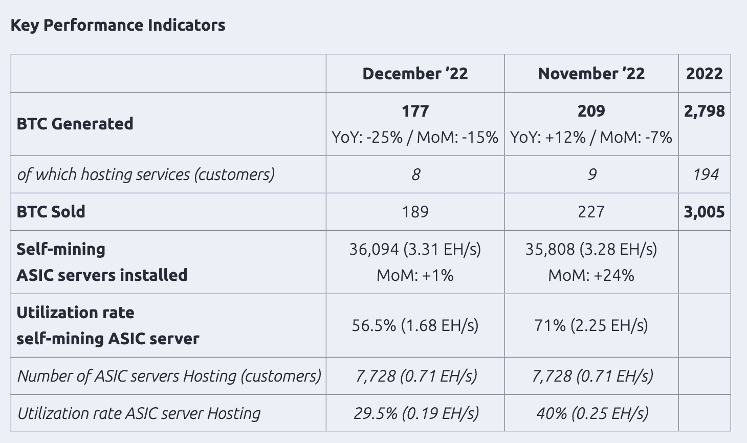 La empresa minó un total de 177 Bitcoin, lo que supuso un descenso del 25% interanual y del 15% intermensual. Esto se debió a los elevados precios de la energía, especialmente en Europa, que provocaron que las máquinas ASIC desplegadas en Europa tuvieran periodos de inactividad en los que no podían producir de forma continua.