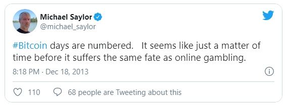 Como se mencionó anteriormente, Mode no es de ninguna manera la primera empresa que cotiza en bolsa en asumir exposición en Bitcoin. Ilustrando este cambio está el CEO de MicroStrategy, Michael Saylor. En 2013, Saylor descartó públicamente Bitcoin en Twitter: